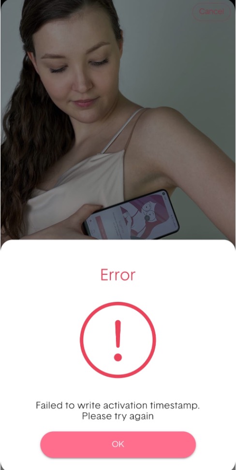 This error message is displayed when the activation process was not successful. Since the femSense app update to version 2.2.3, the activation process now consists of two steps, each marked with a vibration when it was successful. The first vibration confirms that the Patch has been recognised. The second vibration confirms the actual activation of the Patch.